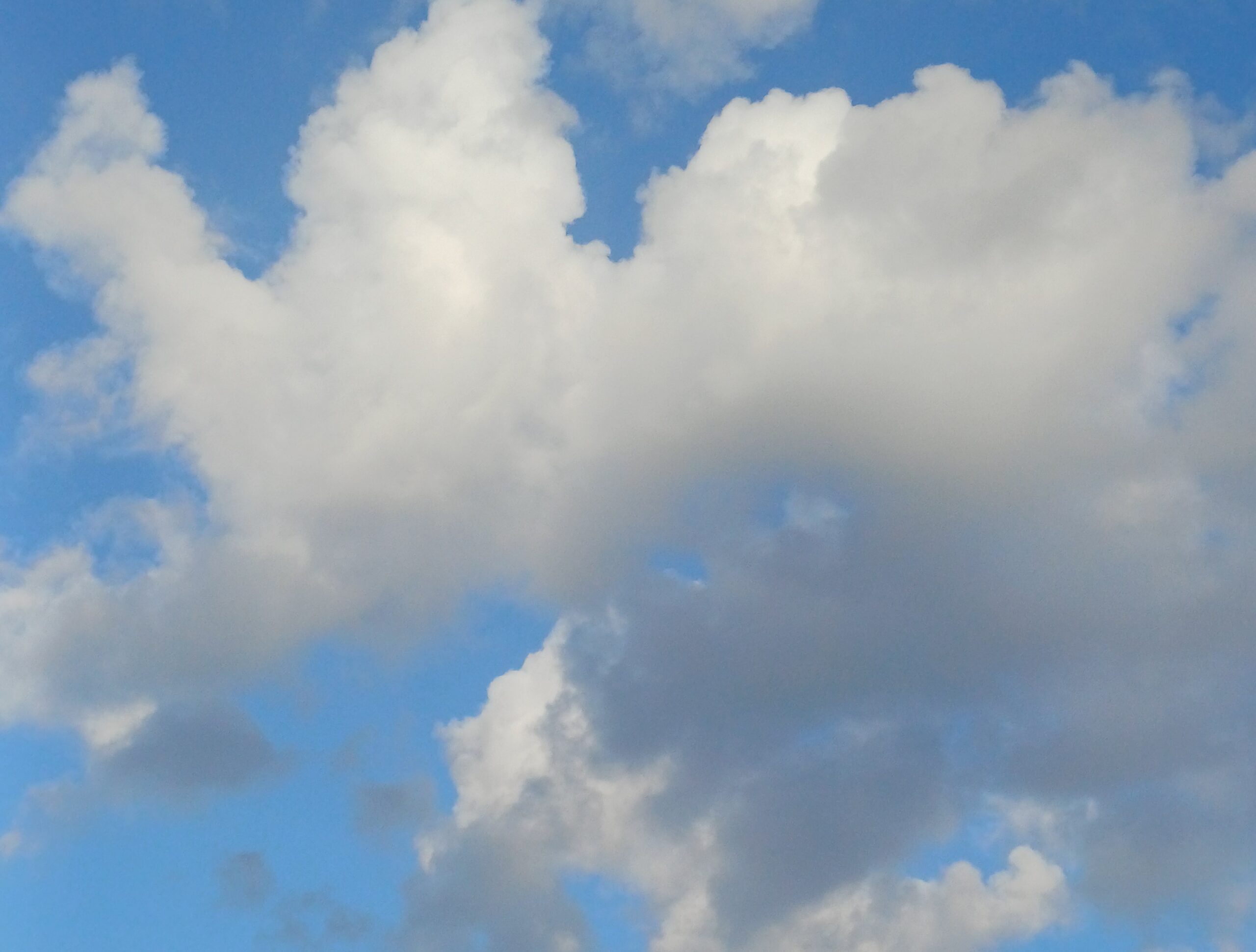Weiße Wolkenberge ziehen über den blauen Himmel. Einige graue drängen sich in den Vordergrund. Einige weiße Wolken scheinen sich auflösen zu wollen.